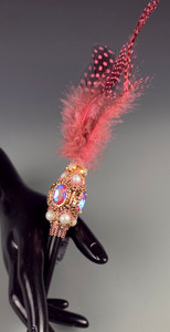“Nom de Plume” is a captivating geometric bead weaving project that blends precision, texture, and a touch of playful elegance. Featuring dazzling crystal stones nestled in intricate settings, luminous crystal pearls, and carefully coordinated seed beads, this design is brought to life with a unique flourish of colorful rooster feathers.